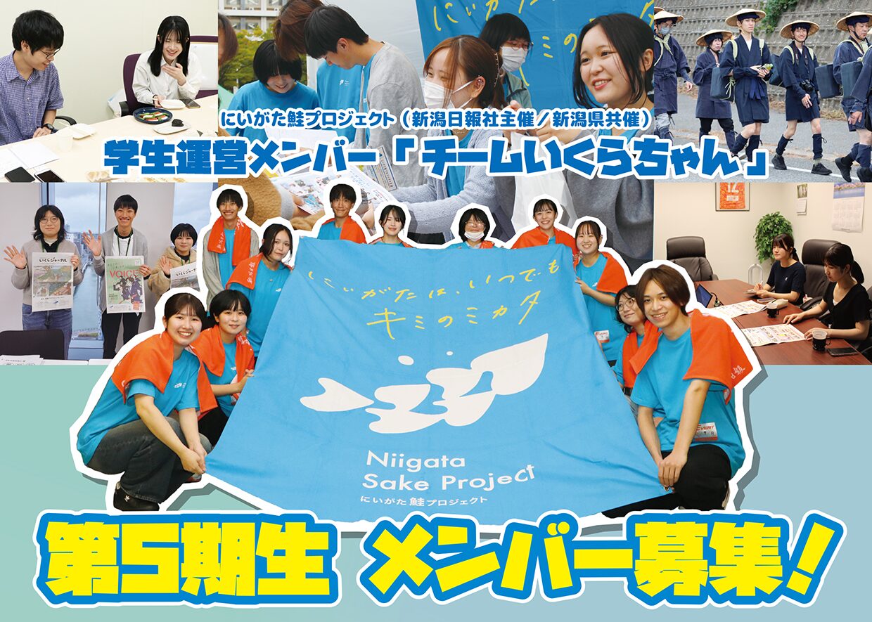 にいがた鮭プロジェクトの学生運営メンバーです。新潟の情報発信や鮭プロPRのために、イベントの企画・運営や、取材活動、オリジナル新聞『いくらジャーナル』の作成などを行います。一緒に新潟を盛り上げていきましょう!