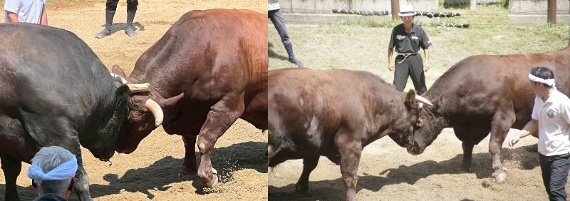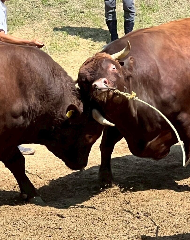 実際の取り組みが始まると、その迫力に圧倒されました。若い牛はツノを押し合わせるようにして、まるで遊んでいるかのように押しては引いてを繰り返します。一方で経験を積んだ牛は、相手のツノの下に潜り込むように押し込んだり、横から入り込んで押し出したりと、明らかに戦術的な動きを見せます。牛同士がアイコンタクトを交わし、まるで意思疎通しているかのように見えた瞬間もありました。