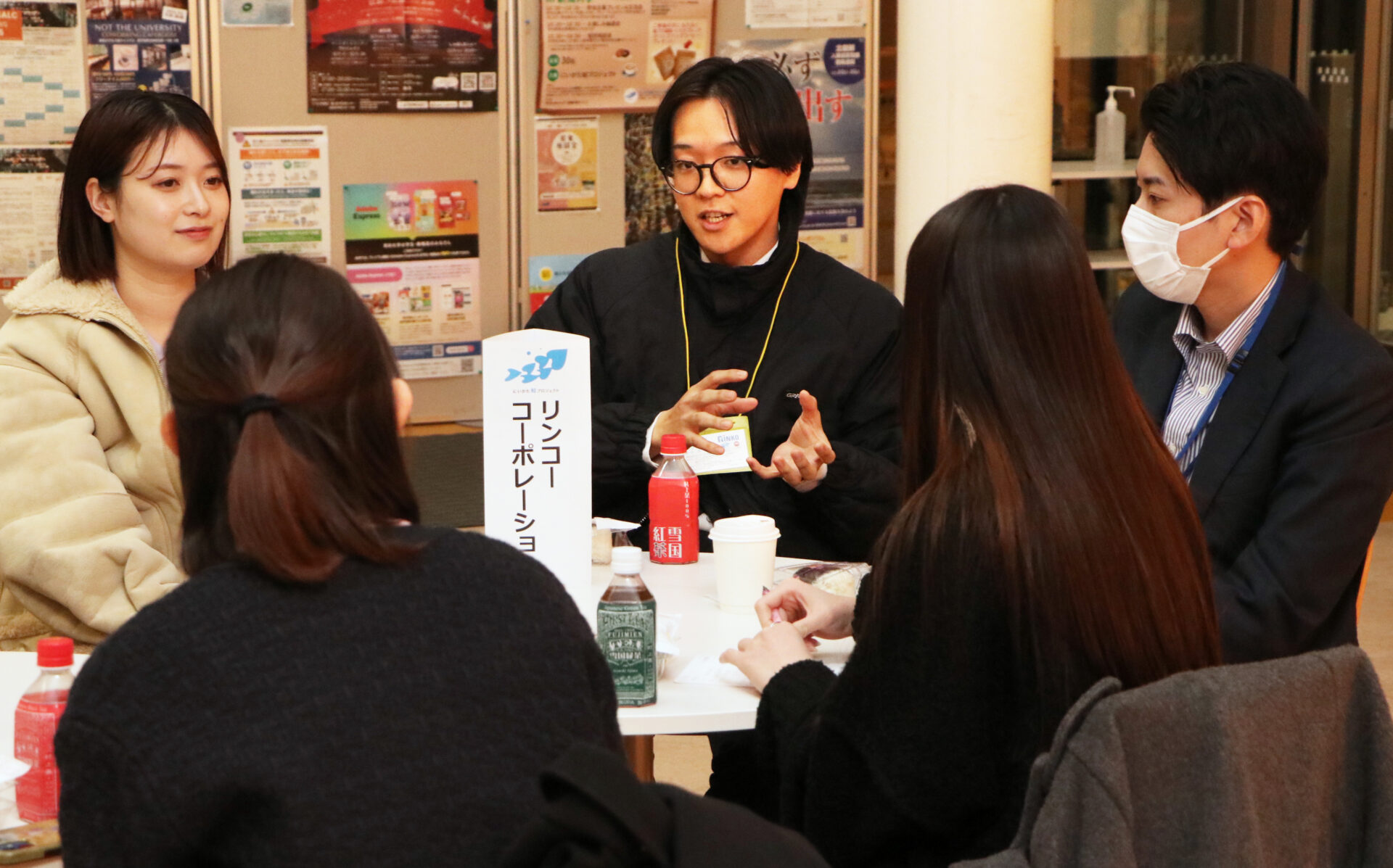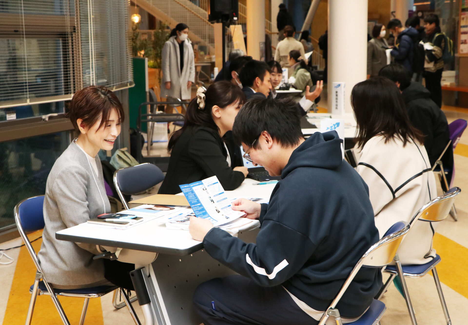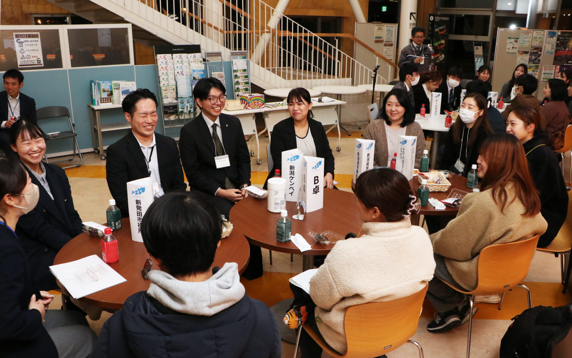 カフェでテーブルを囲んだのは、両日とも7社それぞれの若手社員と学生6人ほど。「各社の成長できる環境を知りたい」「仕事でストレスを感じたときは?」「就職を公務員と民間で迷っている」…。一人一人が顔を合わせてじっくり会話できる近さで、社員らは仕事から就活に関する悩みまで学生の質問に丁寧に向き合っていました。