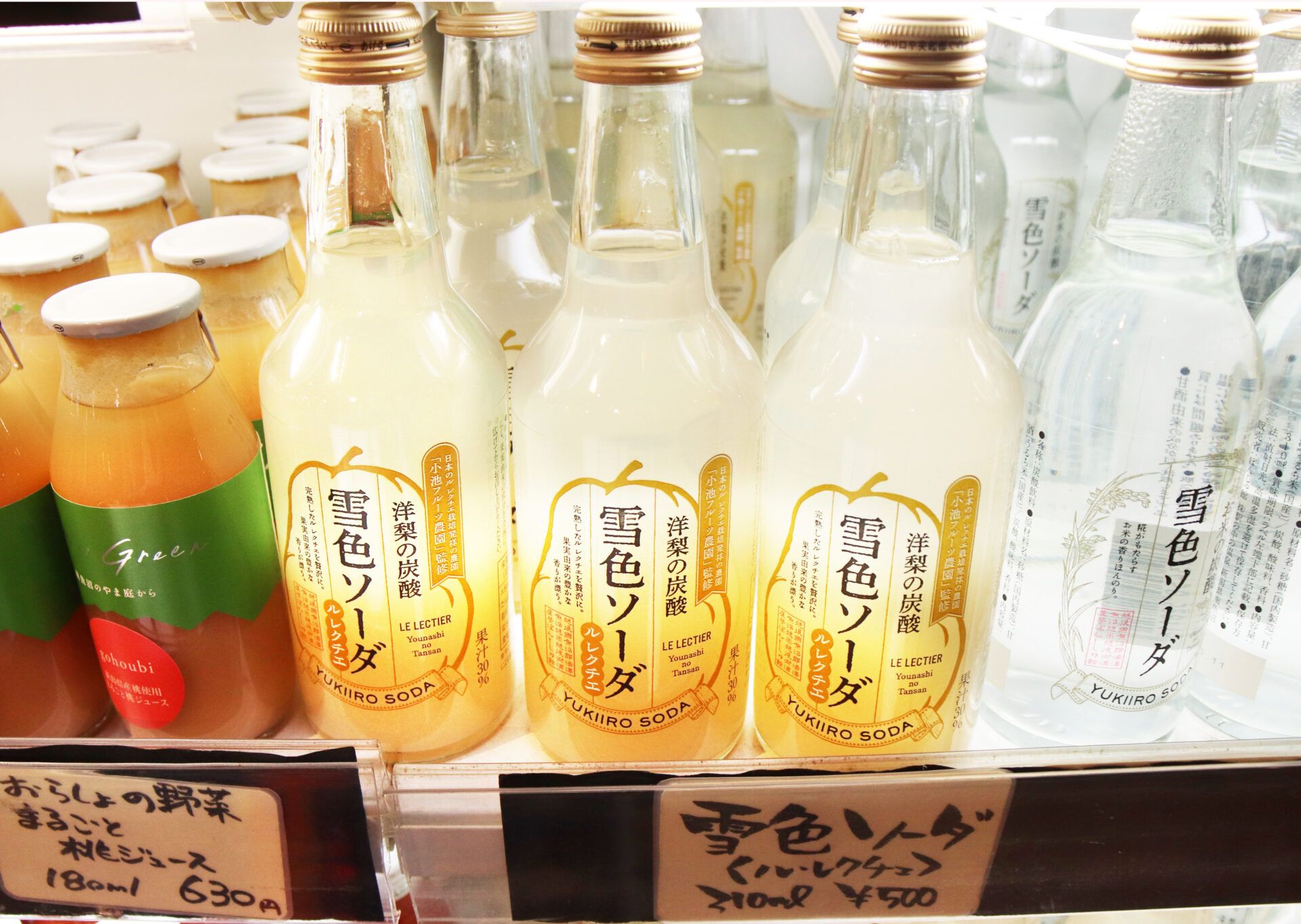 ル レクチエの栽培農家さんの話では、傷ついたものだとか規格外のものが結構出るようです。そうなると本来の値段で売れないものですから、これを活用することで農家の支援をできないか、ということで、オリジナル商品の「雪色ソーダ」の原料として採用しました。