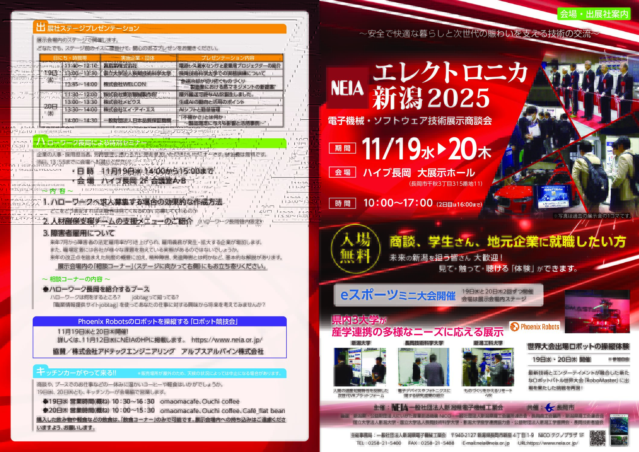 私たち工業会では、若い皆さんにモノづくりの楽しさ、充実感をわかりやすくお伝えしたいと考え、毎年11月半ばに開催している展示商談会『NEIAエレクトロニカ新潟』(会場:長岡市のハイブ長岡)に多数の学生さんに来場いただいています。