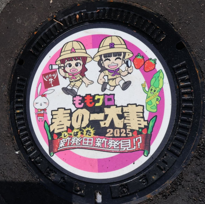マンホールふたは、4月に五十公野公園で開かれたライブイベントのタイトル「ももクロ春の一大事2025 新発田新発見!?」のロゴを中央に、メンバーのイラストや新発田市のマスコットキャラクターなどを描いたデザイン。3種類あり、諏訪町1の東公園、大手町6の新発田城址公園、月岡温泉の足湯「湯足美(ゆたび)」に10月に設置された。