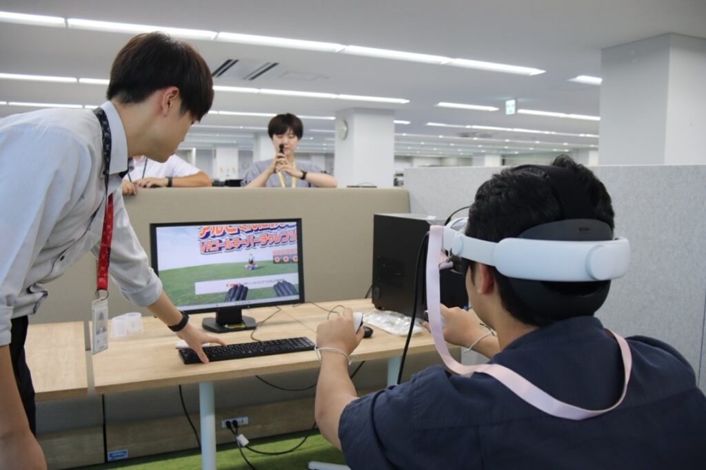 ITエンジニアの方々が働く「開発センター」に移動し、同社が力を入れる「XR(クロスリアリティ)システム」を体験させてもらいました。XRシステムとは、VR(仮想現実)やMR(複合現実)といった現実世界と仮想世界を融合させる技術のこと。体験型3D・VR映像で信濃川沿いの風景を体験できるアプリケーションや、VR 上でサッカーのPK対決ができるVRゴールキーパー体験アプリを実際に使わせてもらいました。