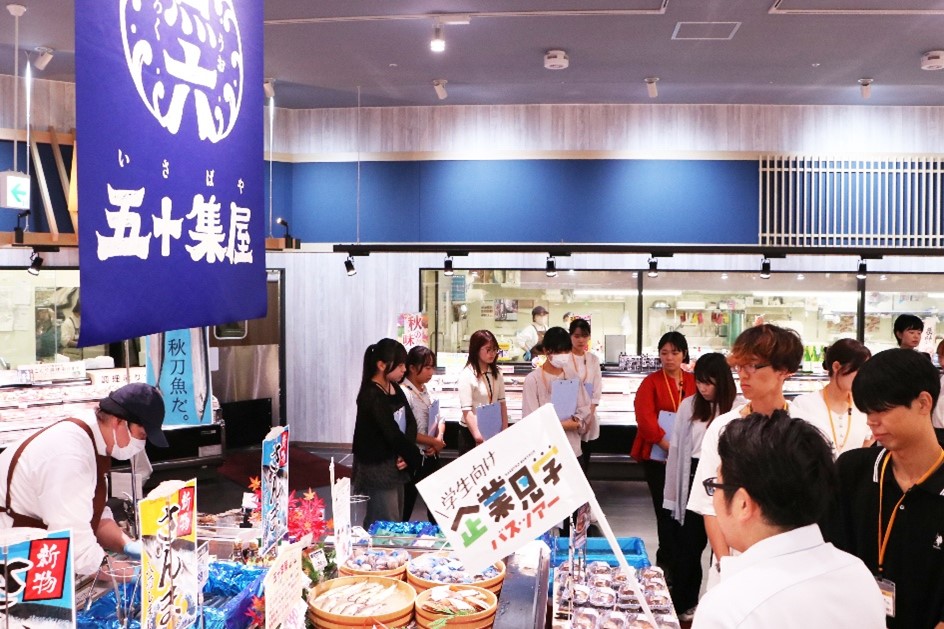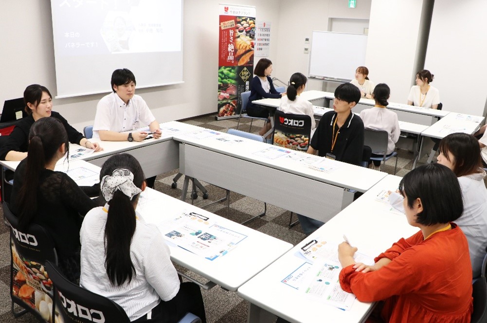 社員との座談会では、若手や中堅が就職の決め手や地元で描く将来像など幅広い話題を語りました。「もともと食べることが大好きで、人事部の温かい雰囲気で就職を決めた」「地元にいると、人生設計が立てやすい」―。社員はときに笑顔で、ときに真剣な表情で学生に話し掛けていました。
