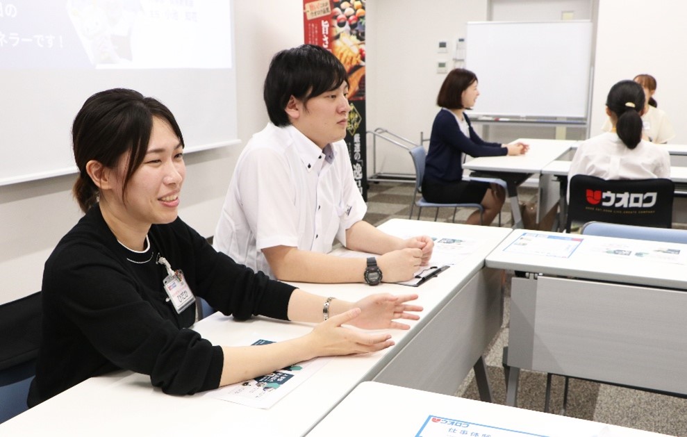入社して1年目は店舗勤務から始まるそうです。人事部の社員は「新入社員は品出しをしながら商品を覚え、徐々に業務を任せてもらえるようになる」と説明。先輩社員からのフォローや役員を前にした発表会などを通した「自律型の人材」を育てる教育環境も紹介され、「1年目の社員のモチベーションが変わってくる様子を見ていると、やりがいを感じる」と話していました。