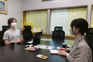 最後には、1~3年目の若手社員3人とグループに分かれて座談会。大学で学んでいない分野への就職に不安を抱く学生の質問には、若手社員も当初は知識がなく不安だったと語り「入社後の研修を通じ、身につけた知識で仕事に取り組んでいる」と経験談を紹介しました。